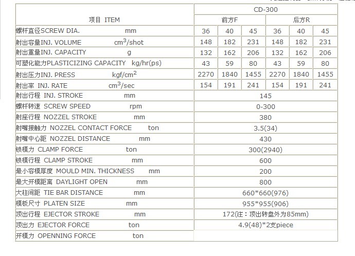 螺桿直徑:前方:36 or 40 or 45、后方:36 or 40 or 45(mm)、鎖模力:300(2940)(tonf(kn))、大柱間距:660*660(mm)