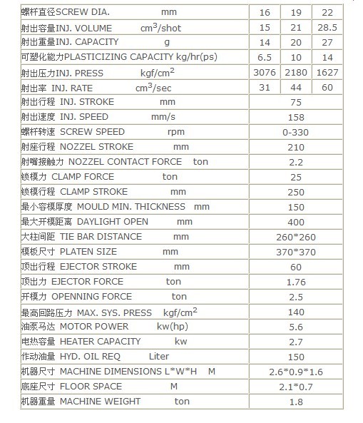 螺桿直徑:16 or 19 or 22 (mm)、射出速度:158/201(mm/s)、鎖模力:25(ton)、大柱間距:260*260(mm)
