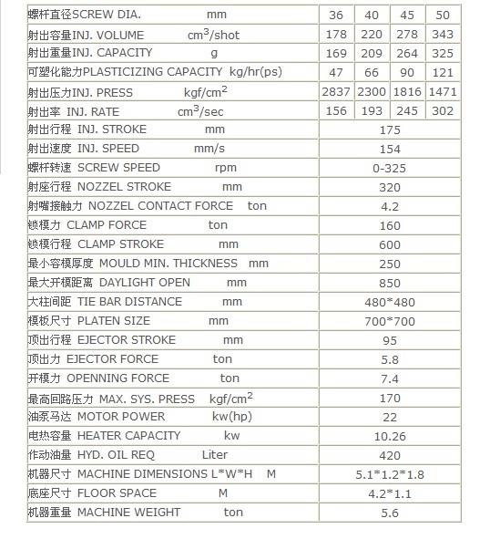 螺桿直徑:36 or 40 or 45 or 50 (mm)、射出速度:154/192 (mm/s)、鎖模力:160(ton)、大柱間距:480*480(mm)