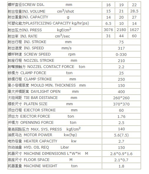螺桿直徑:16 or 19 or 22 (mm)、射出速度:317 (mm/s)、鎖模力:25(ton)、大柱間距:260*260(mm)